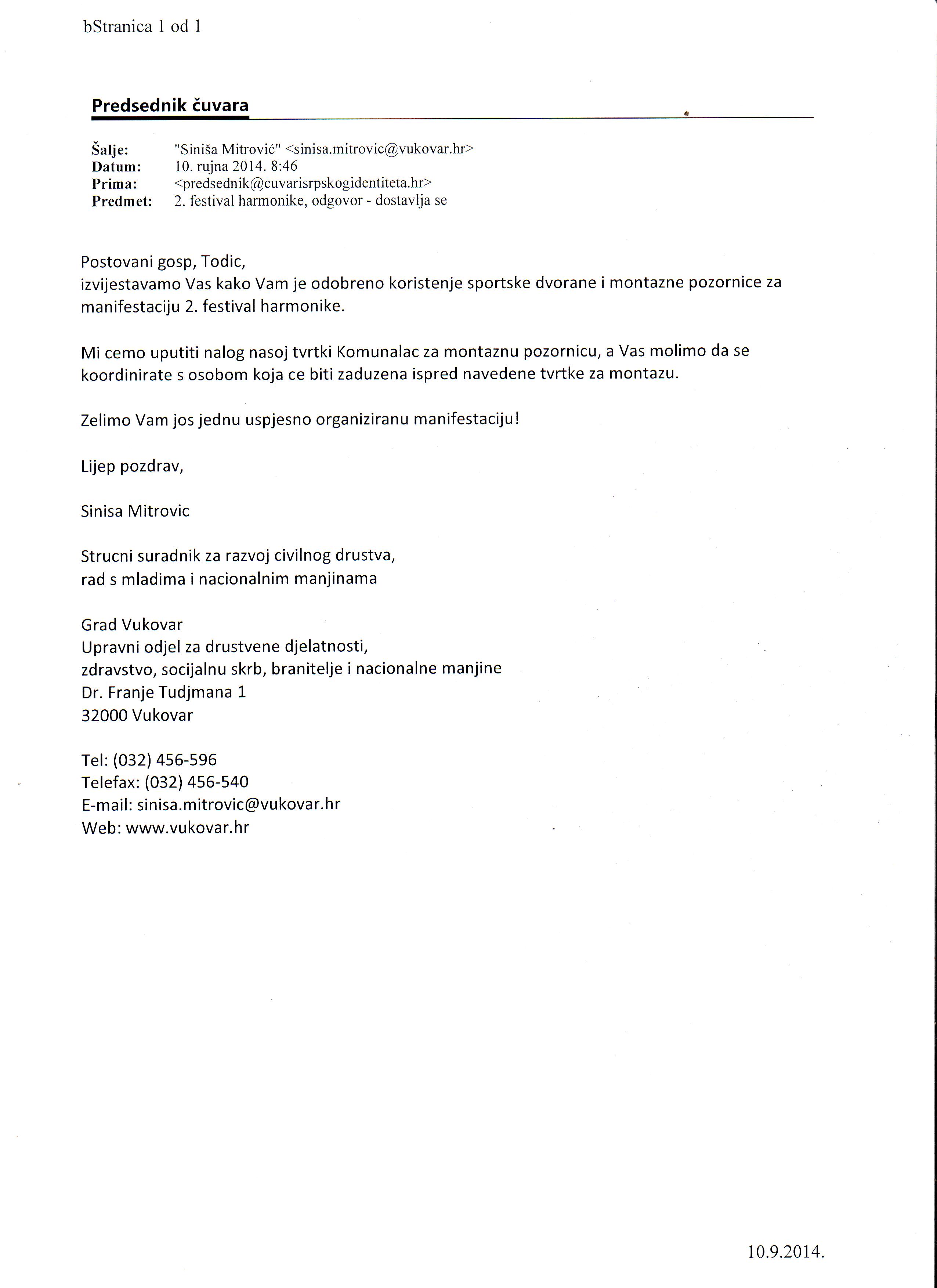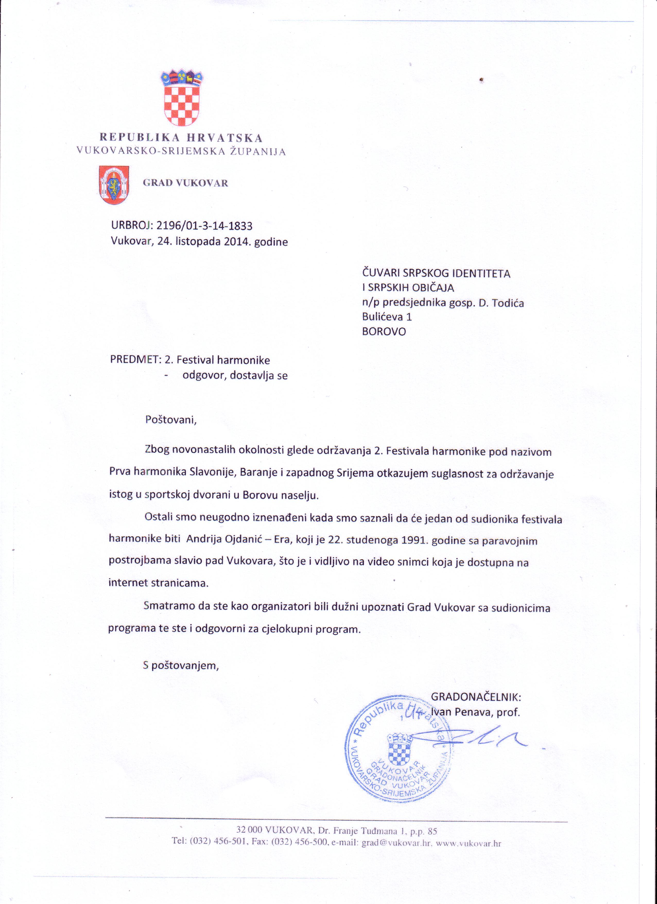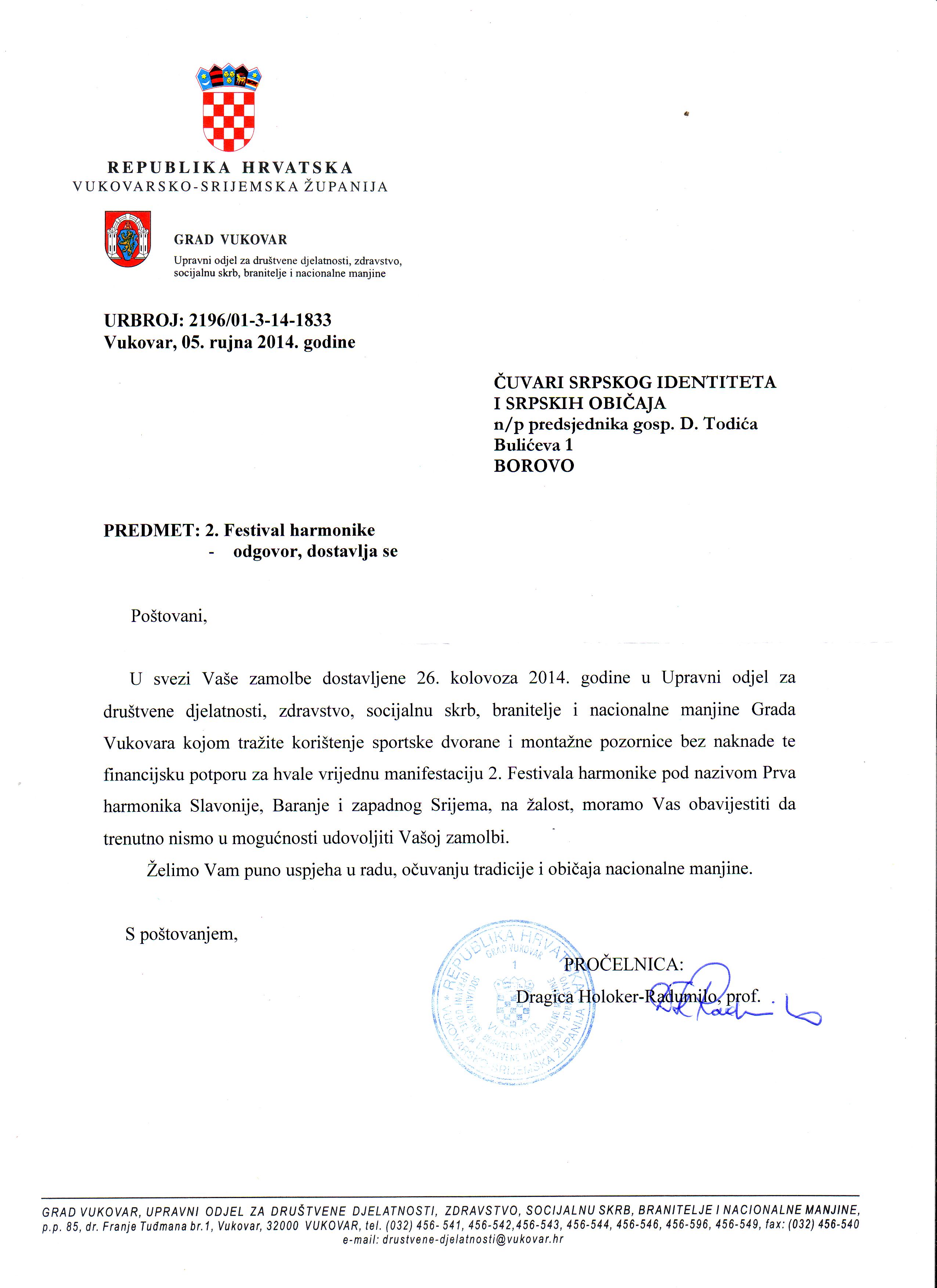 Obaveštavamo javnost da je grad Vukovar (ured gradonačelnika) otkazao korištenje prethodno odobrene sportske dvorane u Borovu naselju vezano za održavanje 2. Festivala harmonike, pod nazivom PRVA HARMONIKA SLAVONIJE, BARANJE I ZAPANOG SREMA, Vukovar 2014.