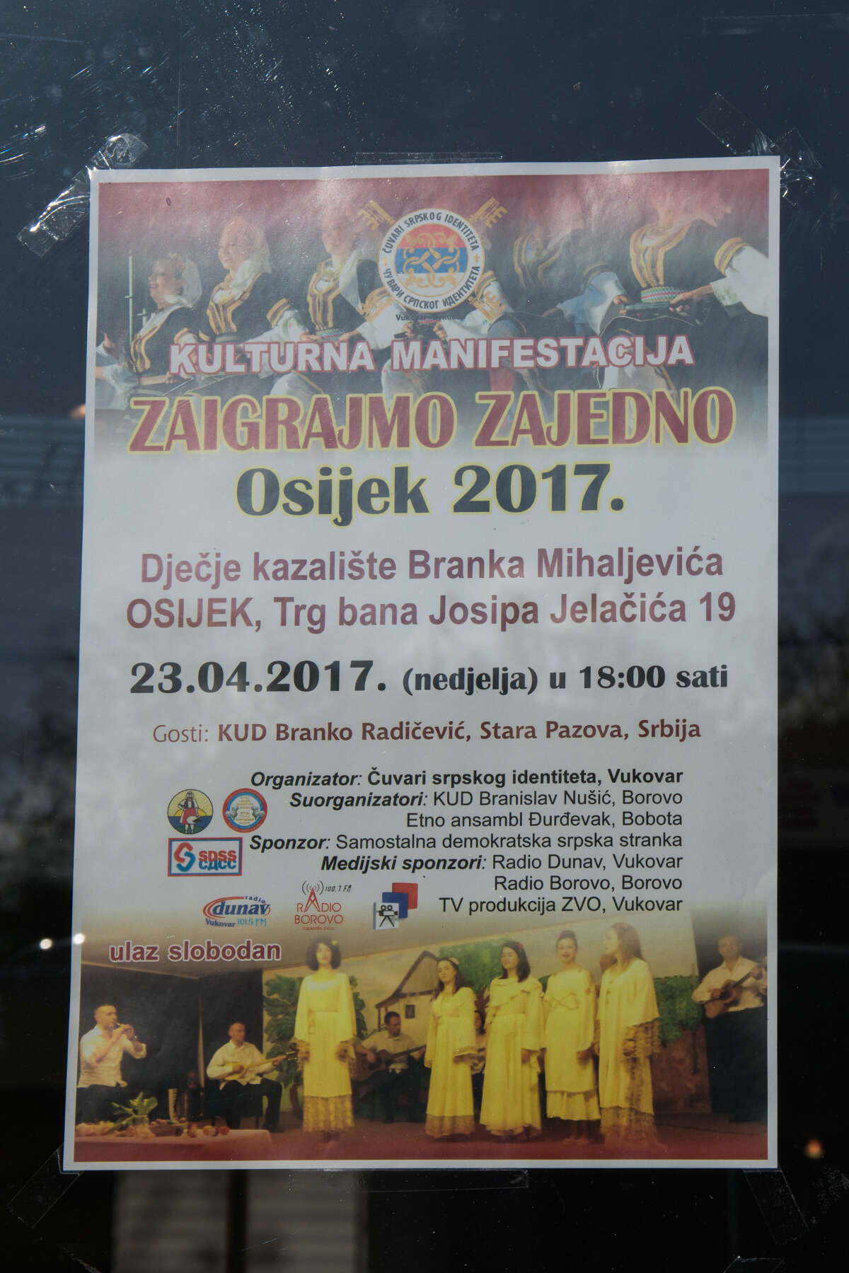 - Danas je u Osijeku u dečijem kazalištu Branka Mihaljevića održana kulturna manifestacija pod nazivom Zaigrajmo zajedno, Osijek 2017. Organizator ove manifestacije je bilo naše udruženje; Čuvari srpskog identiteta, a suorganizatori i učesnici u programu su bili KUD Branislav Nušić iz Borova i Etno ansambl Đurđevak iz Bobote.